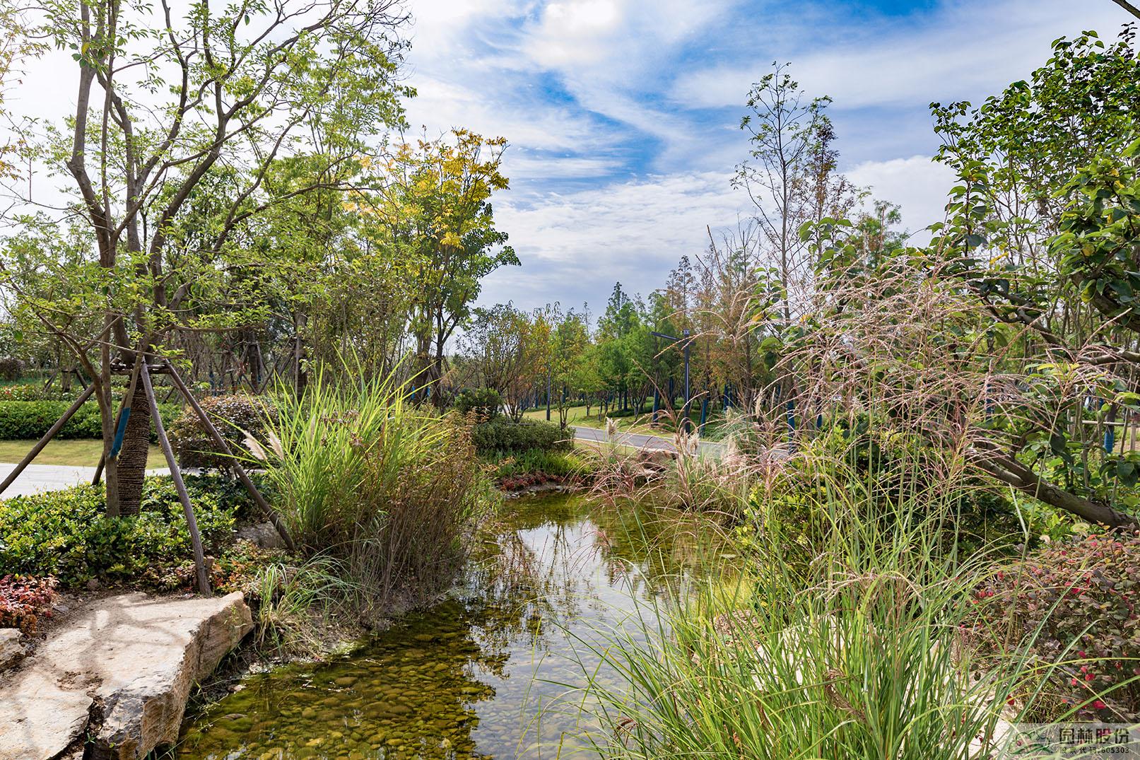 在地形与设施处理上,根据海绵汇水分区、设计调蓄容积等要求,结合现场实际情况,在北段沿线设置植草沟和人工湿地;南段结合现有地形,设置旱溪、湿塘、调解塘、自然式蓄水池等海绵设施。通过各类海绵设施收集、输送、蓄存雨水,并利用水生、湿生植物及砂石土壤对雨水进行截留和净化,通过雨水下渗补充公园绿地土壤水分和地下水。