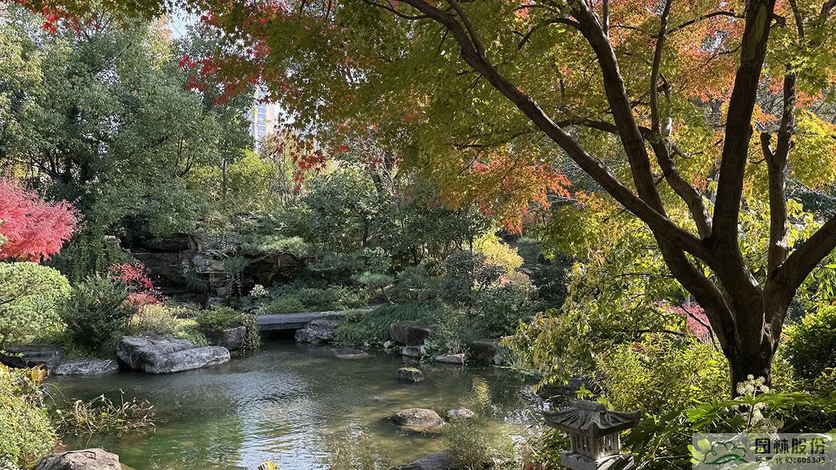 “无枫不成景”。无论是中式庭院、日式庭院,不管在水边、路边,红枫五彩缤纷的叶色,如大自然的调色盘,渲染出画境园的初冬。