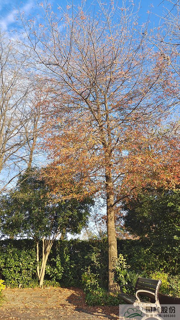 金黄的无患子、绚丽的红枫、黄红变换的枫香构成了画境园初冬缤纷世界的三部曲。半岛的乌桕、池塘对岸的水杉水松池杉混交林,则如跳动的音符,共同谱写着初冬的乐章。